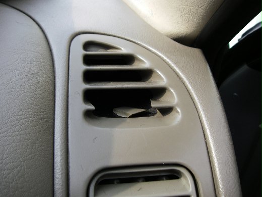 本人在下我最近又遇到了一起不悅的經驗,寒流來襲,近日尋訪多家中古汽車商,打算買一台代步車,在交車時赫然發現空調出風口的葉扇有斷裂損壞的情形(如圖),我立即聯絡中古商業務人員告知這情形,隔天立刻將車開回車行要求更換,此一部份為車行委託汽車百貨行加裝避光罩,因其人員安裝不當而損毀,想當然車行與百貨行要為此負起全責,但就在我前往百貨行與老闆洽談時聽到他如此惡劣的回應:「這是因為車子日積月累經陽光照射,導致葉扇脆化,這不是我們造成的。」這是什麼謬論呀!我剛買不到二天的車子你居然說是車子本身的問題,那我是不是要回頭找車行退貨,我並非共產制度下毫無思想的死老百姓怎麼可以三兩句話就給擺平,我語氣堅定的說:「當初我們看車的時候,這個部份是完整無缺的,如今交車卻變成這樣,車行的業務員也說他不知情,那怎麼會這樣呢?」老闆又裝傻問說:「要不然你想怎麼處理?」我則反問:「那你想怎麼處理?」,最後我感覺老闆心虛難堪,決定要幫我更換。