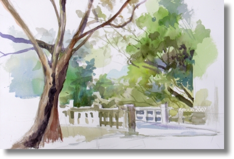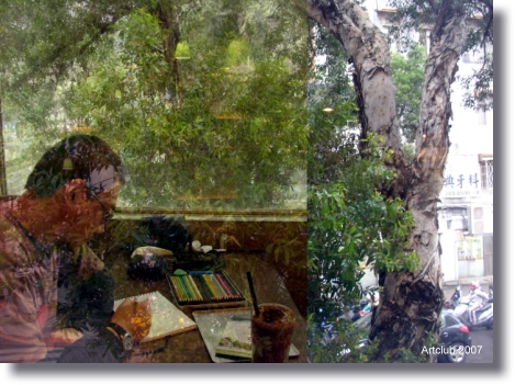 窗外的樹木正盯著作畫的我,因為它忌妒我桌上有豐富色彩的畫筆,其實你不必擔心,因為我正在為你裝扮著華麗的外衣。