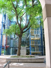 ……建築師理察‧羅傑斯(Richard Rogers,1933~)以全透明的玻璃大樓化解了基地狹窄與採光不易的窘境,他們保留了檢驗協會另一棟二級古蹟建築(Coronation House)的建築立面作為新建築的主出入口,並以中庭裡的老樹為軸,規劃出一片猶如扇狀的建築平面,扇骨部位為新大樓的辦公區,扇葉的部分則為高達十層樓高的室內挑空,這些挑空不占任何面積,也大可將日光充分引入室內。因為新建築完全隱藏在古建築群中,因此外人極不易察覺,唯有走進老房子的大門,繞過中庭的老樹才能看見另一片天地,這種設計方式頗似東方庭院建築中「藏」的空間趣味。