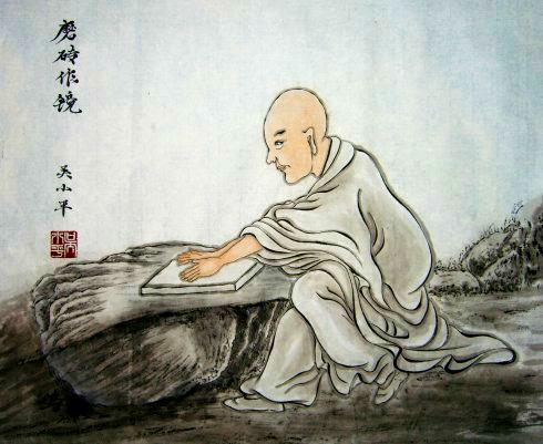 有個小和尚入得廟來,想快快成佛,每天不論做什麼都口念佛號。老和尚看不下去,決定點化他。有天老和尚拿個磚頭,在廟前用力磨著一塊大石頭。小和尚問師父在做什麼?老和尚說要把磚頭磨成鏡子。小和尚回:「這塊磚頭磨再久也磨不成鏡子啊!」老和尚答:「對啦,像你這樣時刻念佛號,念再多、再久,也念不成佛,你得做點別的事啊!」