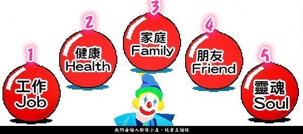 人生就像在空中不停拋接五個球的遊戲,五個球分別是工作、家庭、健康、朋友、心靈,不能讓任何一個球落地。其中只有工作是橡皮球,掉下來會彈上來,而其他四個球都是玻璃做的,如果失手會出現無法挽回,因此每個人都要設法取得平衡;投資也是如此,人生與投資都要講求多元平衡。