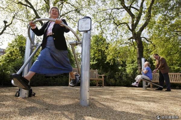 英國倫敦第一個老人遊樂場在海德公園,接著曼徹斯特也開了一家。英國媒體形容,「海德公園裡的老人遊樂場,被樹叢及繁花包圍,比倫敦其他的付費健身房都還要花團錦簇;健身器材只簡單五項,仰臥起坐的長椅、固定腳踏車…」,不太酷炫,絕對練不出人魚線,卻能讓老人留住足夠支持行動的肌力。
