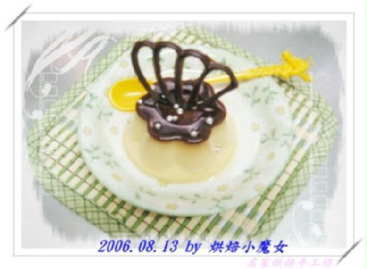待溫度稍溫時,即可取出先前之紅糖凍,並將布丁液倒入,