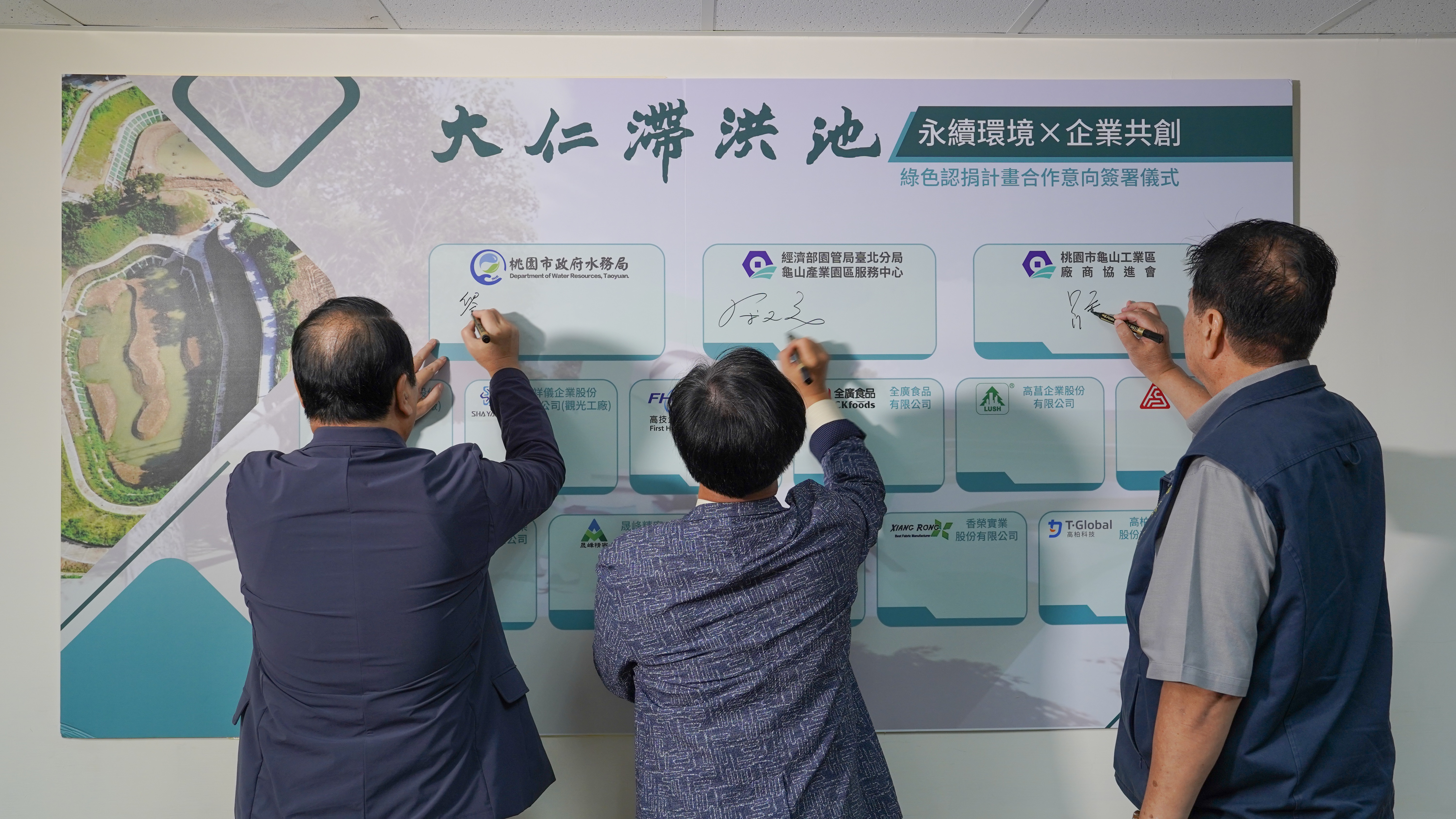 本次活動特別安排「綠色認捐簽署儀式」先由桃園市政府水務局長劉振宇與經濟部產業園區管理局臺北分局長梁又文共同簽署合作意向書為之後的合作創造無限可能。接著由各認捐企業代表在簽名板上逐一完成簽署,象徵承諾投入公共建設、共創美好社區,最後由水務局長頒發感謝狀予企業代表,包括南僑油脂事業股份有限公司、祥儀企業股份有限公司、高技企業股份有限公司、全廣食品有限公司、高菖企業股份有限公司、復盛應用科技股份有限公司、太古可口可樂股份有限公司、晟峰精密工業股份有限公司、佳總興業股份有限公司、香榮實業股份有限公司及高柏科技股份有限公司等11家廠商,在儀式中展現企業對環境永續的重視,並透過植樹、設施捐贈、觀光工廠體驗及物資提供等多元方式,展現了企業「取之於社會、回饋於社會」的精神,樹立永續共好的標竿,充分體現了企業是地方最堅強的夥伴塑造「企業即社區夥伴」的良好形象。