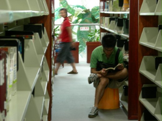 偌大的圖書館裡,幽靜清涼;除了偶有幼童失控狂奔驚呼,最多也只是些無傷大雅的瑣細雜音;後方小女生緩緩翻動著書頁,斜對角考生的筆在桌上來回滑動,隔壁老人家窸窸窣窣打開手提紙袋拿出老花眼鏡,管理員掃描條碼的嗶嗶聲。還有,中年男子躡足走過書架,又猶豫轉身回頭的腳步聲,和偶爾不知趣的手機下載鈴聲,以及微微弱弱的鼾息。