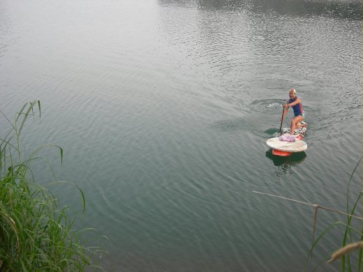 有時才上岸,待人客氣的丈人便把手邊收成一一分送給了早泳朋友,甚至也曾與釣客互贈收穫。菜園裡所有可以想像得到的各式工具,小到水桶、鋤頭,大到木板、帆布、竹桿,鐵絲網,全靠俩人平日沿路撿拾人家堆在路邊的廢棄物,再一點一點載送,修復或拼湊而成。撿來的東西到了碧潭岸邊,利用浮板或跟店家借遊潭的小船來回搬運。遇到比較輕的物品,就直接用大型塑膠袋包成一包,再拿條繩子綁在腰間,用抬頭蛙慢慢拖過河去。