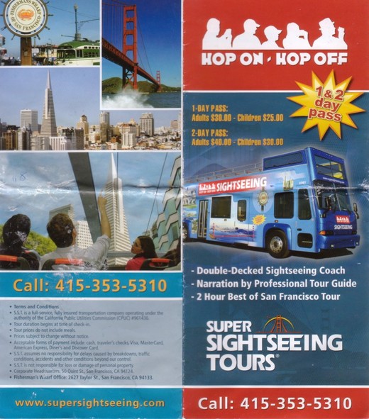 其實當萍將車一開進舊金山市區, 我們心裡已知道不可能開著車在裡面觀光. 我們的開車經驗, 是無法在這麼繁忙又陌生的大都會中自在遊覽的. 所幸將車停致妥當, 另謀良方; 嘿! 上帝就是恩待我們, 竟然這公園裡, 就是觀光開頂巴士必停的一站! 我們無意中見到巴士靠邊暫停, 就上前詢問拿了說明及路線圖; 一人$15USD 車資, 一日遊 .共計有十五個點, 想在任何景點都可以下車, 然後等下班同型的觀光巴士搭乘前往下個目的地, 非常適用於我們這種膽小的鄉巴姥!