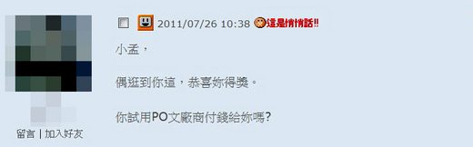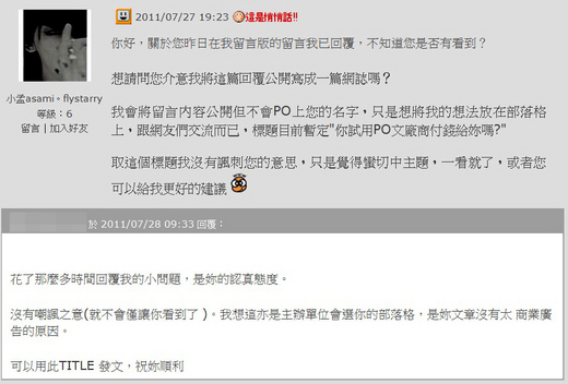 PS. 留言的內容公開,以及這篇文章的標題都事先徵詢過這位網友的同意才公開以及取用。