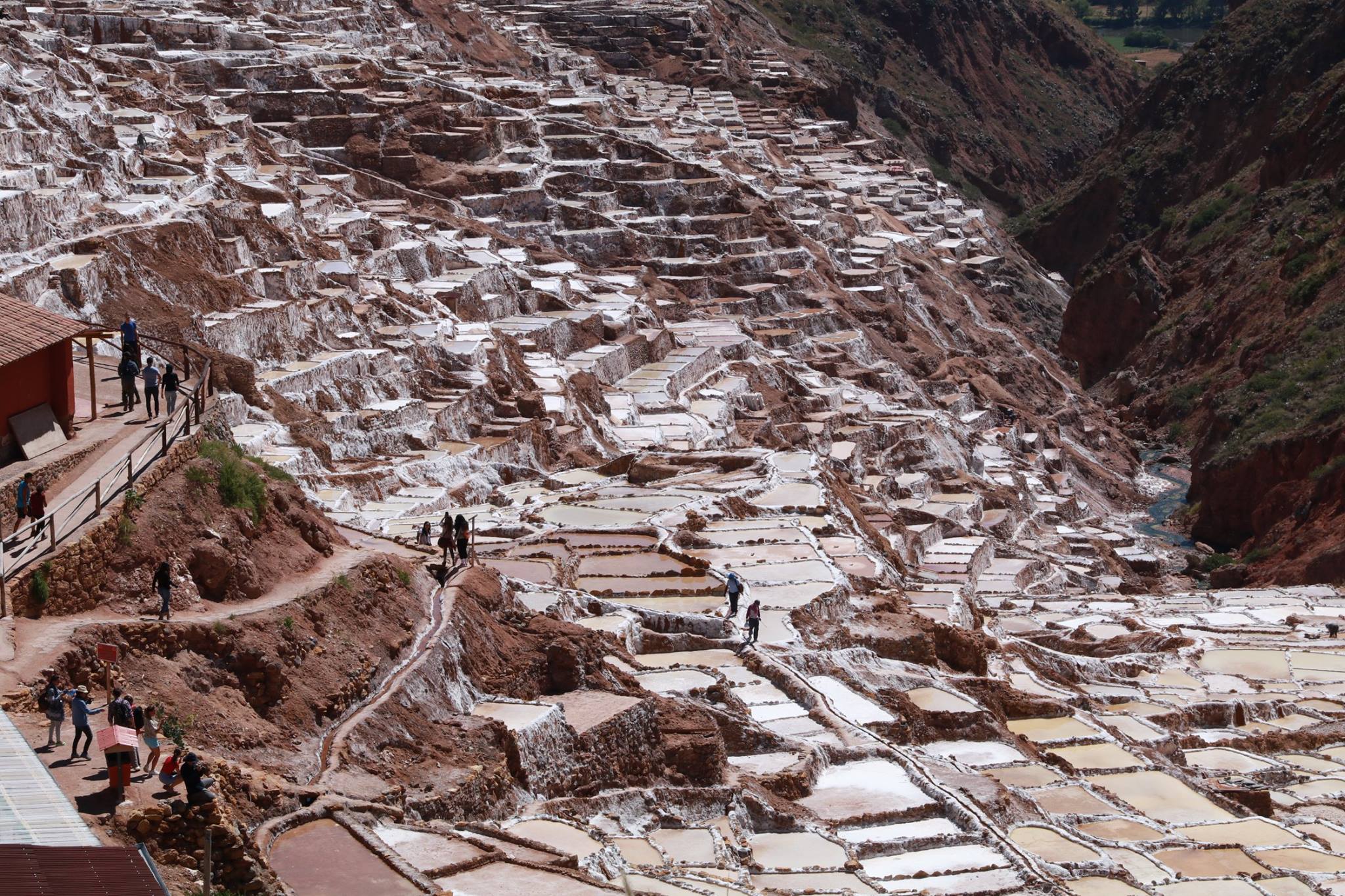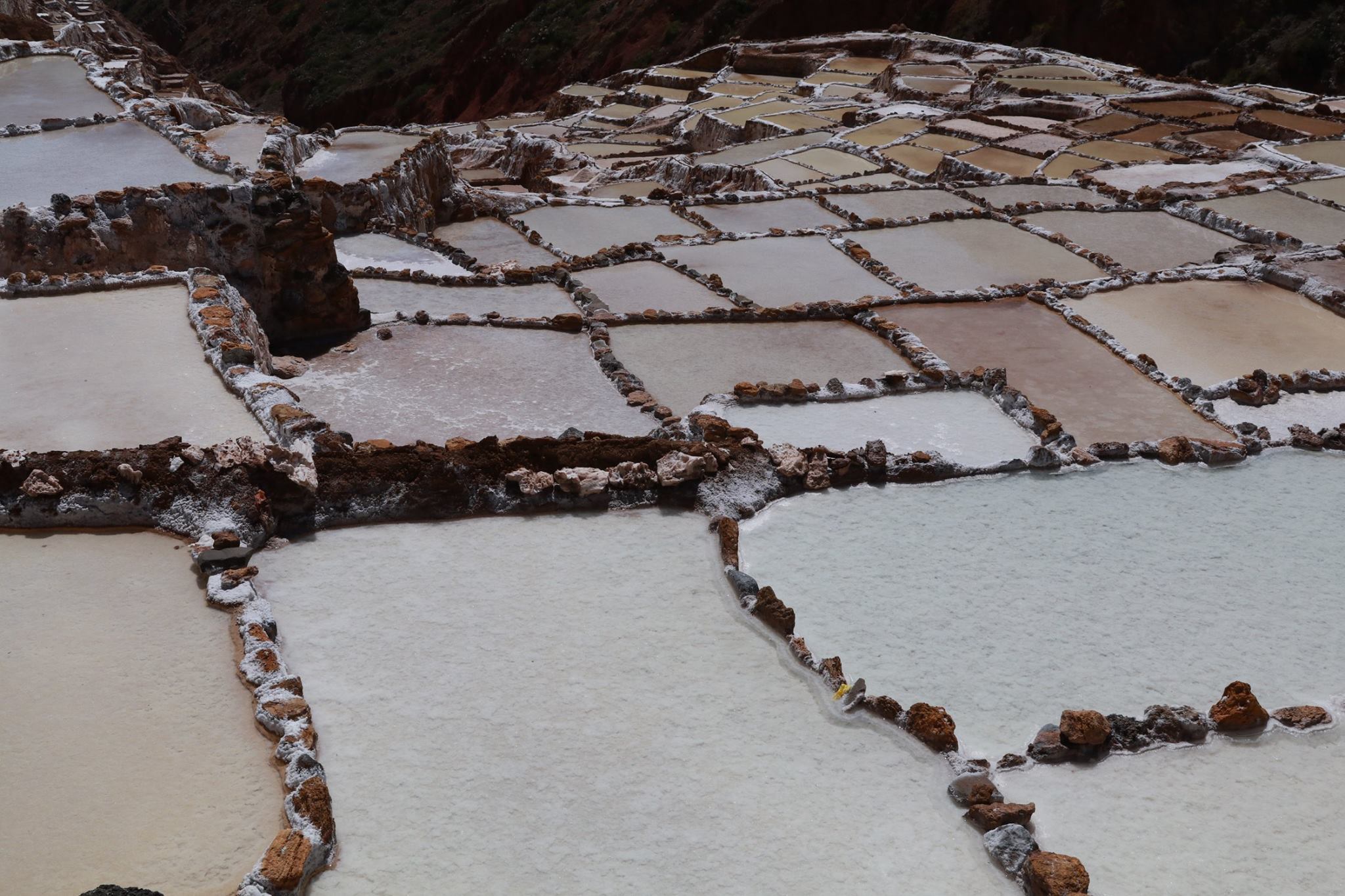 安地斯山脈雖非沃土,但老天給了祕魯人一項小禮物做補償,可惜小禮物落入美國人口袋。走進高山岩鹽小鎮Maras,映入眼簾的是一畦畦的鹽田,遠看像白、粉黃、淺褐、深褐色巧克力堆疊的糖果山。該鎮的開發遲至20世紀,美國企業出資開挖,因此,多數利潤都進了美方投資客口袋。這裡的鹽田依深度,開採出三種岩鹽:兩種粉紅色岩鹽,味道不同,屬於食用鹽,褐色的礦鹽具醫療效果,顏色和成分的形成來自礦物質多寡,褐色礦鹽中的礦物質最豐富。