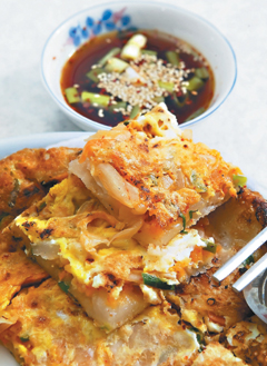 1泡菜煎餅:泡菜、紅蘿蔔絲等,並加入獨家配方和麵粉煎成。沾醬油食用,味道更佳。150元