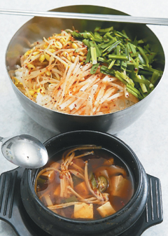 3韭菜拌飯:香噴噴的白飯蓋上豆芽、韭菜、白蘿蔔絲,口味清爽。再配上菜、豆腐、香菇和馬鈴薯所熬煮的湯品,溫暖可口。130元