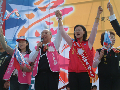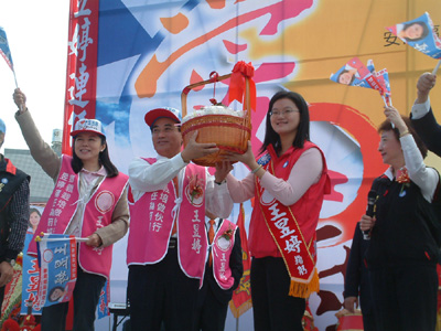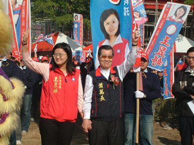台南市第一選區尋求連任的立法委員王昱婷,今天(2日)上午在安南區、北區交界的北安橋畔(北安路一段314號)成立競選總部,國民黨副總統參選人蕭萬長、國民黨主席吳伯雄、立法院長王金平、國民黨中評委主席林澄枝等四巨頭齊站台;蕭萬長將競選綵帶披掛在王昱婷肩上,吳伯雄授旗,王金平、林澄枝也趕來為王昱婷致贈包粽與好彩頭等吉祥物,黨政四巨頭除了為王昱婷三屆九年立委的亮麗政績強力背書外,更希望她能為國民黨力保府城一立委席次,理性問政為選民謀福利。