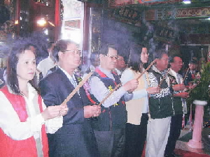 蕭萬長昨循古禮,向大眾廟鎮海元帥上香、獻花、獻酒並暖壽,蕭萬長隨後表示,到府城參拜鎮海元帥,有飲水思源,吃果子拜樹頭意思,祈求大眾爺保佑人民生活能好起來,,希大家選一個能為大家做事的人來拼經濟,人民生活才會快樂幸福。