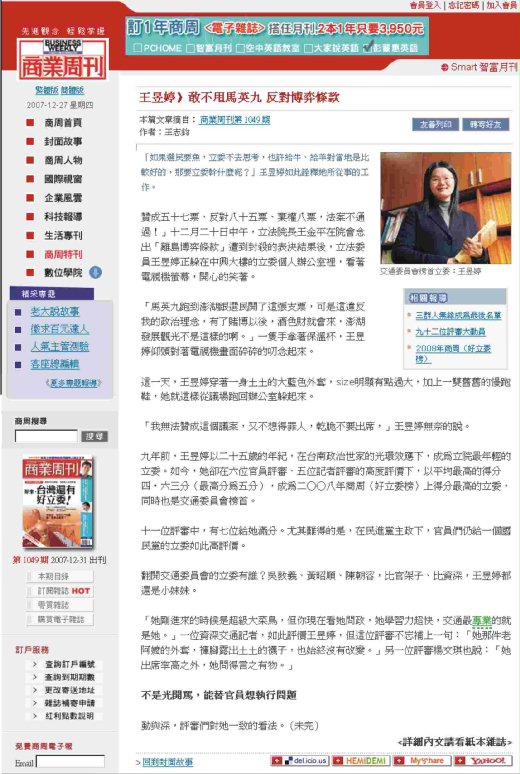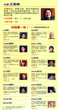 成為2008年商周〈好立委榜〉上得分最高的立委,同時也是交通委員會榜首。......」----選自《商業周刊》1049期/2007.12/第141頁