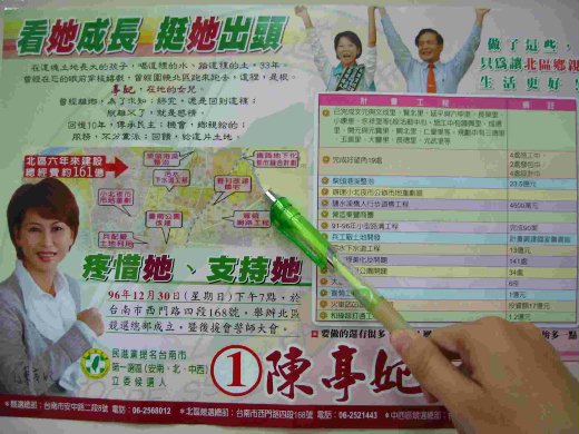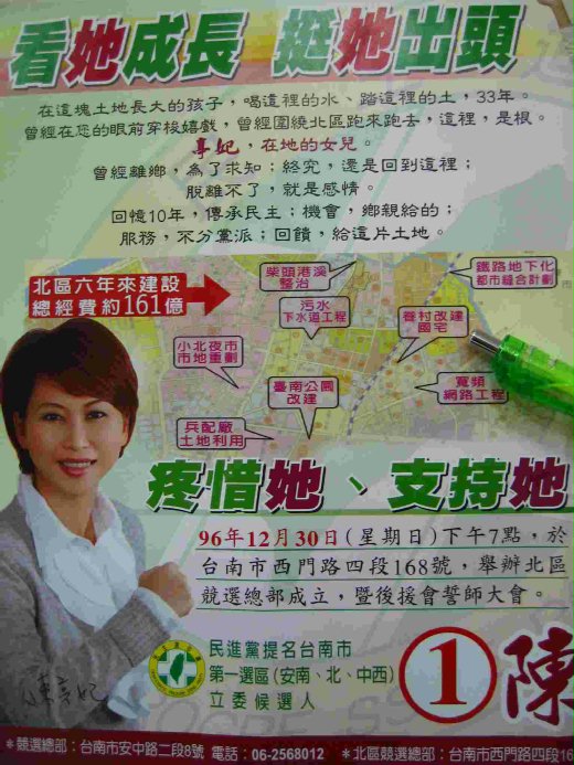 「雙面政客,惡質無恥!」針對民進黨台南市第一選區立委候選人陳亭妃28日起大量印發的北區選舉文宣,內容標榜其六年來為北區爭取161億建設經費,並將北區眷村改建國宅列為重大政績。此舉引發北區長榮、大道兩新建眷村住戶的群起反彈,抗議陳亭妃近日來一方面於各選舉造勢場合,指控政府福利獨厚榮民榮眷,並印發大量文宣誣稱他們為「走路兵」,眷改條例為「錢坑法案」;同時竟又將北區這幾年改建完畢的眷村國宅,列為陳一己之政績。北區長榮、大道兩新建眷村管理委員會,29日連袂至國民黨第一選區立委候選人王昱婷競選總部,遞交陳情書,表達眷村住戶對陳亭妃惡質卑劣的競選手段,最深沉的抗議與憤怒!