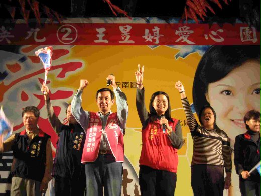 立委選戰進入決戰階段,國民黨第一選區立委參選人王昱婷七日晚間在北區競選總部舉辦「馬英九愛心團結」晚會,國民黨總統候選人馬英九親自南下府城為王昱婷站台造勢;小馬哥除強打「民生經濟牌」外,也公開為王昱婷告急,呼籲中間選民一定要出來投票、衝高投票率,更要提防民進黨一切「小人奧步」,大家政黨票投給10號國民黨,「台南若是贏,台灣一定會大贏」。馬英九七日也夜宿府城,由王昱婷安排借住其鞋業後援會會長林連發家中,並拜訪府城重量級鞋業界代表,為王昱婷鞏固鞋界票源。