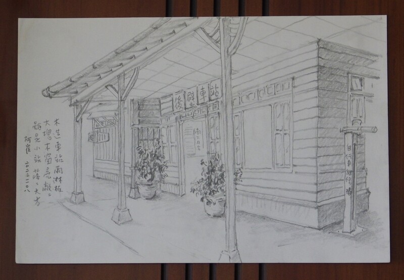 後壁車站原名後壁驛,主結構為日式四坡廡殿頂。初建於1902年,經1941嘉南地震,1943年整修。日式木造,外觀魚鱗板、ㄚ形木柱繞迴廊,水泥瓦、基座洗石子。南部的陽光,可不一般,到站已然午後三點,站前廣場仍見”無米樂”的雕塑,瞧著後壁驛,造型簡樸又落落大方。靜靜的午後,一支筆與一老站,默默相望、互訴情懷。