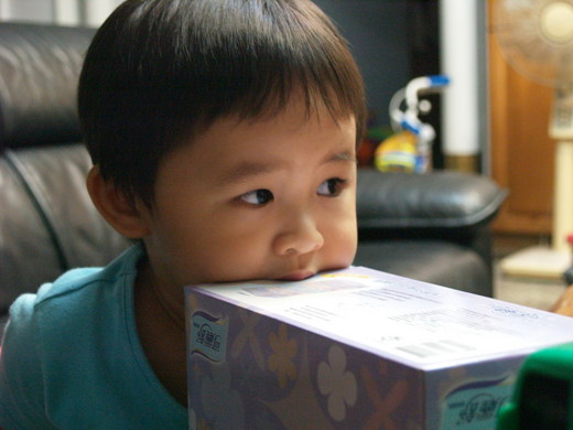他(三歲囉)到現在最喜歡玩的東西,就是一顆球,還是我球場撿來的------軟式的棒球,八個月大時他拿來當固齒器,兩歲時就拿來扔,現在是拿來打。