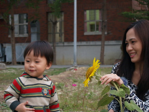 那朵向日葵的頭低了下來,花瓣上盡是我倆兒子的口水,也少一小片花瓣,它在小兒子的嘴裡,在大兒子對向日葵的拜拜聲中,我們離開了校園。