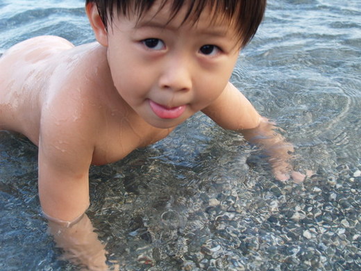 剛過完三歲生日,三歲看老,子誼浮上些奇怪的個性,愛淨怕髒,只要有沙子沾上手腳,便不厭其煩的用海水洗,在沙灘上還要乾淨,怪不得他會累。