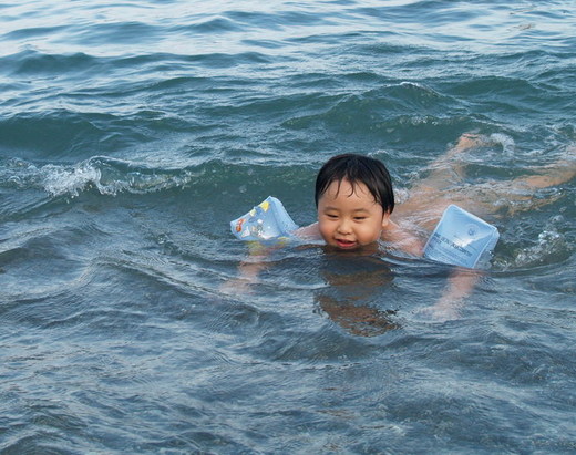 小子誼猶豫,花了許多時間在觀察環境,他意識到海不一樣了,海水「跑了上來」讓沙灘少了一半,海浪拍打有他半個人高,不過,大兒子的笑聲吸引著他,這孩子,只要一決定事情,就做的比誰都還要快,我還在放包包,他已經把自己剝光,扔來衣服褲子。