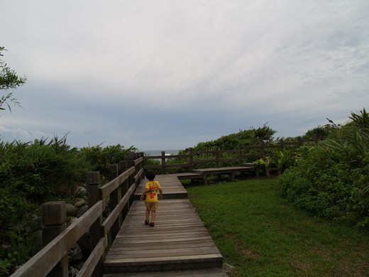 經過的幾座漁村悄靜不見人煙,遊走在石雨傘景點的木造便道,小兒子不知,婚前我曾背著你爬上斜坡,他看草皮上的石碑,一心想著要爬上去,見我搖頭,偏頭看懸崖下的海,說著要玩水,想我們的當年,牽手爬上石傘,和他一樣的心情,想跳下水遊戲。