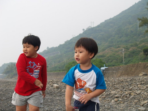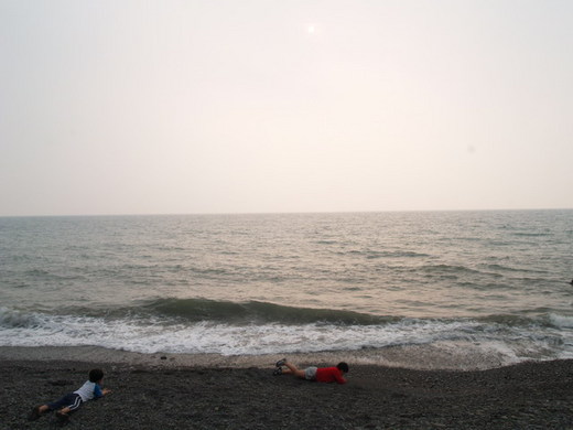 同一個沙灘,想當初,我們決定要結婚也在這裡,或許,孩子感受到這是「命運之地」,在淡黃的暮色中,兩兄弟很享受微涼的海風,與空氣中一股浪漫的的氣息。我們相擁著坐在沙灘上,看他們玩耍,時空詭異的交錯,一會兒是當初的年輕情侶,一會又是兩個孩子的爸媽。