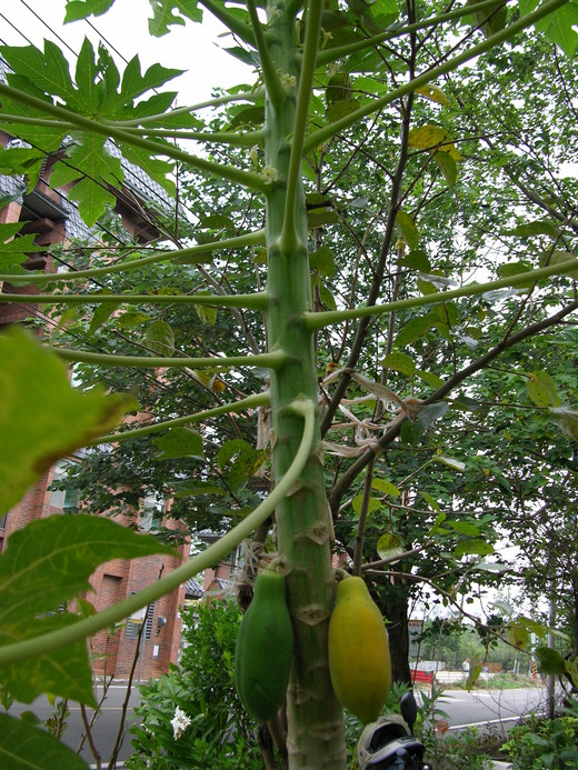 我家門庭有一株木瓜樹,,原本是母株,,沒想到,,生兩粒木瓜後,,