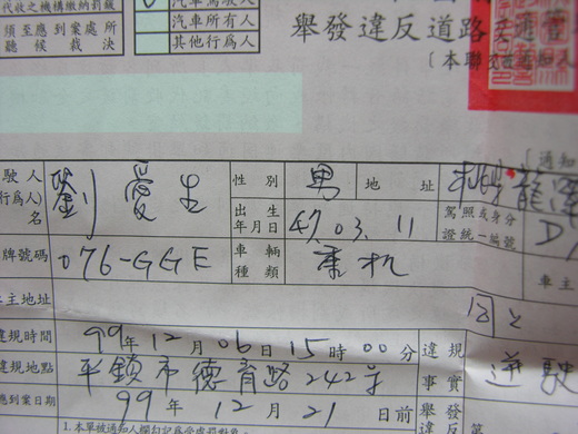 直到1206下午3時許,我依習慣騎車逆向行駛,在最終的轉彎口位置,看到一個警察大哥,在旁揮手,示意我停機車。