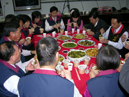 大溪鎮長向多家餐廳訂購十道代表大溪的美食與招牌菜,有百年油飯、大溪土雞、活魚、長年菜、韭菜、雞捲、溪魚蝦、豆干、竹筍與福菜竹筍湯,讓鎮公所主管們圍爐品嘗,分享大溪鄉土年菜料理。