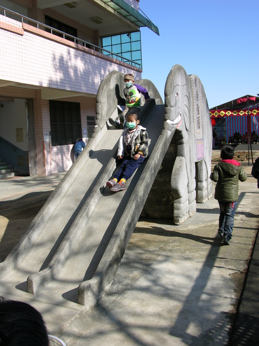 桃園縣龍潭鄉龍源國小在不忍磨石子的老舊「大象溜滑梯」面臨拆除,由校友合資搬遷後,順利保存這座興建40年的大象溜滑梯,以珍貴校產方式替溜滑梯慶生,希望「大象溜滑梯」繼續服役,帶給小朋友更美好的童年歡樂。
