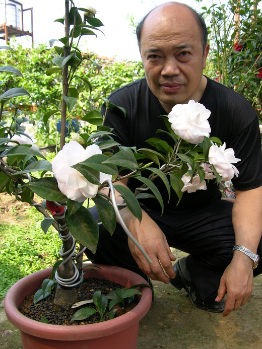 桃園縣大溪警官涂進士以花會友,長期研究茶花疏解工作壓力,成為下班後的休閒娛樂兼養生之道。春天看到心愛的茶花朵朵盛開,任何工作壓力也會拋到九霄雲外,「也因茶花,讓我交到更多好友」。