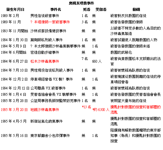 7、1995年3月20日麻原彰晃策動東京地鐵沙林毒氣事件,造成12死,6300多人受傷。其後教主與執行任務的教徒皆被逮捕。