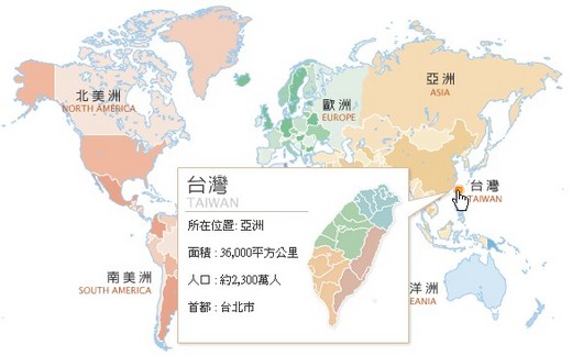 臺灣是個呈南北狹長型的海島,面積約有3.6萬平方公里(14,400平方英哩),位於亞洲大陸東南方、太平洋西岸東亞島弧間,北臨日本、琉球群島,南接菲律賓群島,是往來亞洲各地的樞紐;航空網路四通八達,為非常便利的旅遊地之一。