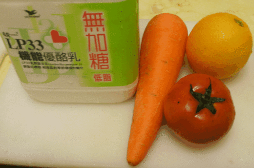 2.將番茄、胡蘿蔔放進果汁機,在加入柳橙優酪乳及冷開水,一起打成