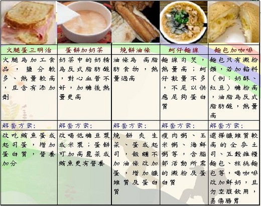 早餐不但要吃,重要的是要「吃得對」。一般人習以為常的早餐選擇,如火腿蛋三明治配奶茶、燒餅油條、蚵仔麵線等,雖然提供了熱量,卻也包含過多的脂肪,甚至是反式脂肪,加上纖維質及優良的蛋白質含量不足,吃多了容易造成肥胖及心血管疾病,反而弄巧成拙。