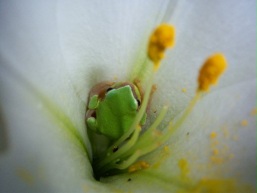 樹蛙躲在百合花裡