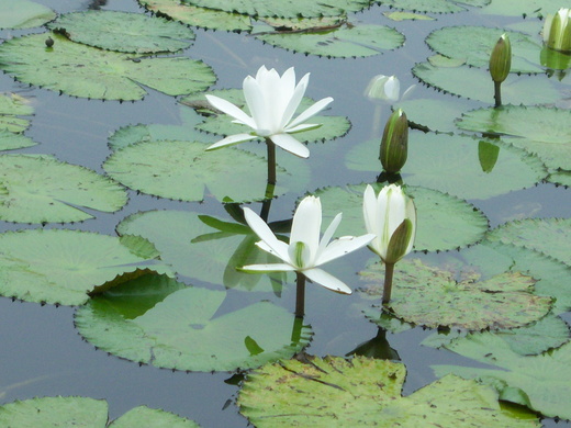 睡蓮的地下莖成塊狀,葉圓形,齒緣,上表面光滑似蠟不霑水,底面有氣胞,配合柔軟的葉柄,使葉片能浮貼於水面,不受水位高低的影響。花朵稍離水面,花期長,晝開夜閉合,因以得名。睡蓮品系繁多,清新雅緻,與荷花各具風格。如今已然成為各處花園水塘不可或缺的觀賞植物。