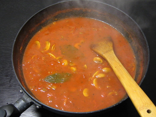 將序章所調理的醬汁以小火悶煮,沸騰後加入之前分別炒好的大蒜,洋蔥,蘑菇和Rosemary(迷迭香),攪拌後再以小火悶煮十分鐘即可(如圖)。