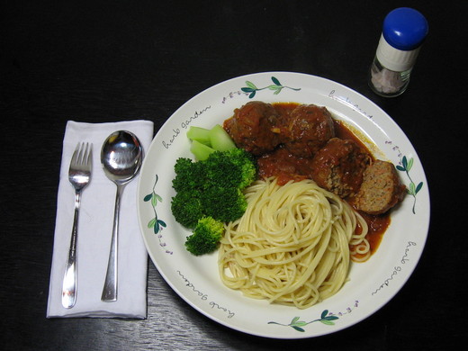 將義大利麵和義大利肉丸番茄醬汁,以及其他的配菜如青花椰菜等排盤,就是一盤可口的義大利家常肉丸麵。