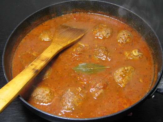 將肉丸與湯汁放入鍋中,並加入紅酒,以小火煮至沸騰,沸騰10分鐘後,加入原先所製的義大利番茄醬汁,以小火煮至沸騰,沸騰10分鐘熄火即可。