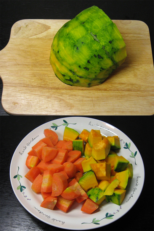 將金瓜微波8分鐘,胡蘿蔔微波5分鐘。