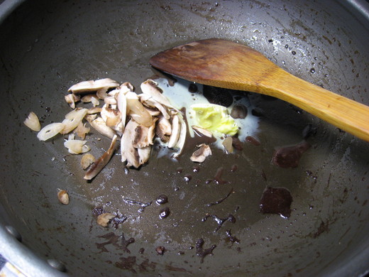 將牛排放到餐盤上,在鍋中的肉汁中加入奶油和蘑菇,如果水分不足可以加入些許的開水,一直到湯汁有黏稠度之後,將小麥粉溶於開水中,用小麥粉勾欠水即可。