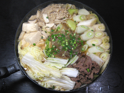 壽喜燒,日文:すきやき,也就是先將肉類在鍋中炒過的意思,大多是用牛肉,所以也可以說是日式牛肉火鍋。炒過的肉和有沒有炒過的肉相比,會有其他的香味。日本的「鍋物」,也就是火鍋類的料理中,所放的具材,通常稱為「鍋の具」,其實跟火鍋料的意思是差不多的。通常,日本人會用很貴的霜降和牛肉(一百克約日幣780円),可是量都會比較少,因為價格太高,吃不多。