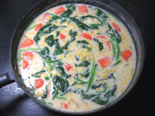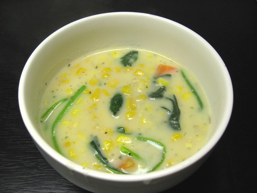 攪拌到濃湯沸騰之後,加入波菜,約一分半鐘後可口的玉米濃湯即完成。