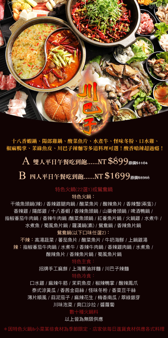 商品訊息簡述: 吃到飽!只要899元起即可享用【川巴子火鍋樓】原價最高2368元平日吃到飽方案:(A)雙人午餐吃到飽/(B)奶H午餐吃到飽,含十八香蝦鍋、陽郎雞鍋、酸菜魚片、水煮牛、怪味冬粉、口水雞、椒麻鴨掌、茉綠魚皮、川巴子辣麵等多道料理無限供應!