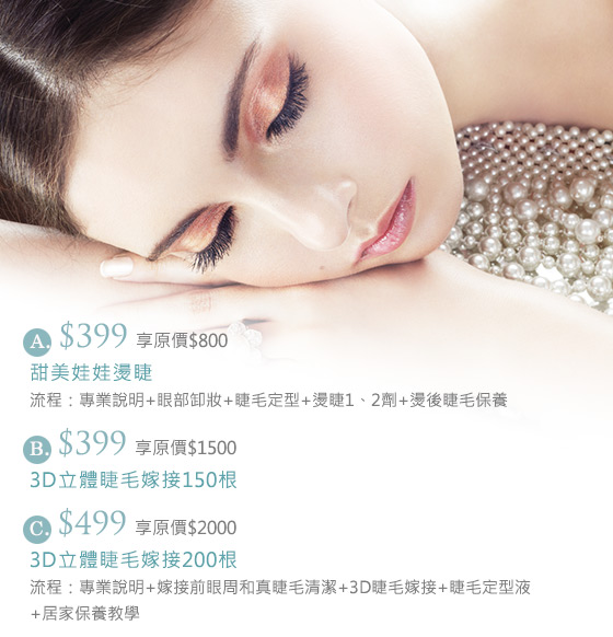 商品訊息簡述: 只要399元起即可享有【集雅藝術沙龍-美睫部】原價最高2000元美睫方案:(A)甜美娃娃燙睫/(B)3D立體睫毛嫁接150根/(C)3D立體睫毛嫁接200根。