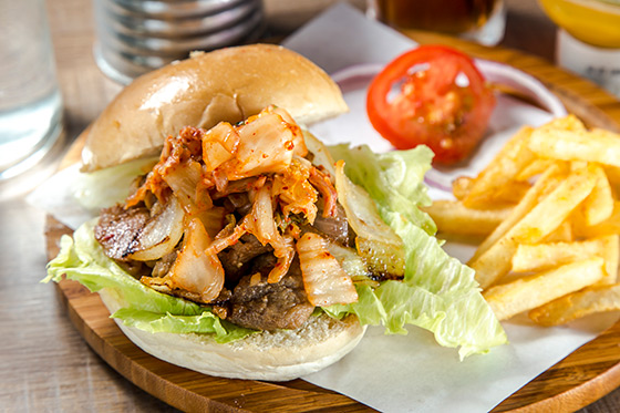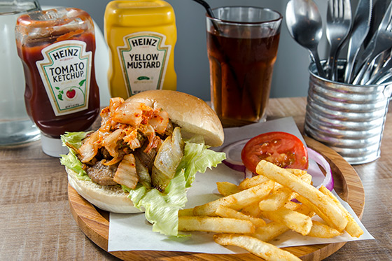 現點現做的霸氣漢堡,這超值的高度絕對無法一口咬下,要怎麼把泡菜的酸辣、豬肉的鹹香與漢堡包的脆軟全吃下,可就留給你來解決這難題!