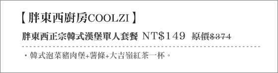 商品訊息簡述: 只要149元起即可享用【胖東西廚房COOLZI】原價374元胖東西正宗韓式漢堡單人套餐:韓式泡菜豬肉堡+薯條+大吉嶺紅茶一杯。