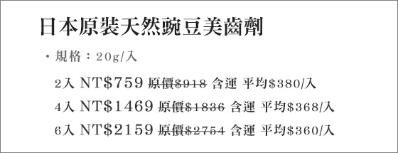 商品訊息簡述: 平均每入最低只要360元起(含運)即可購得日本原裝天然豌豆美齒劑2入/4入/6入(20g/入)。